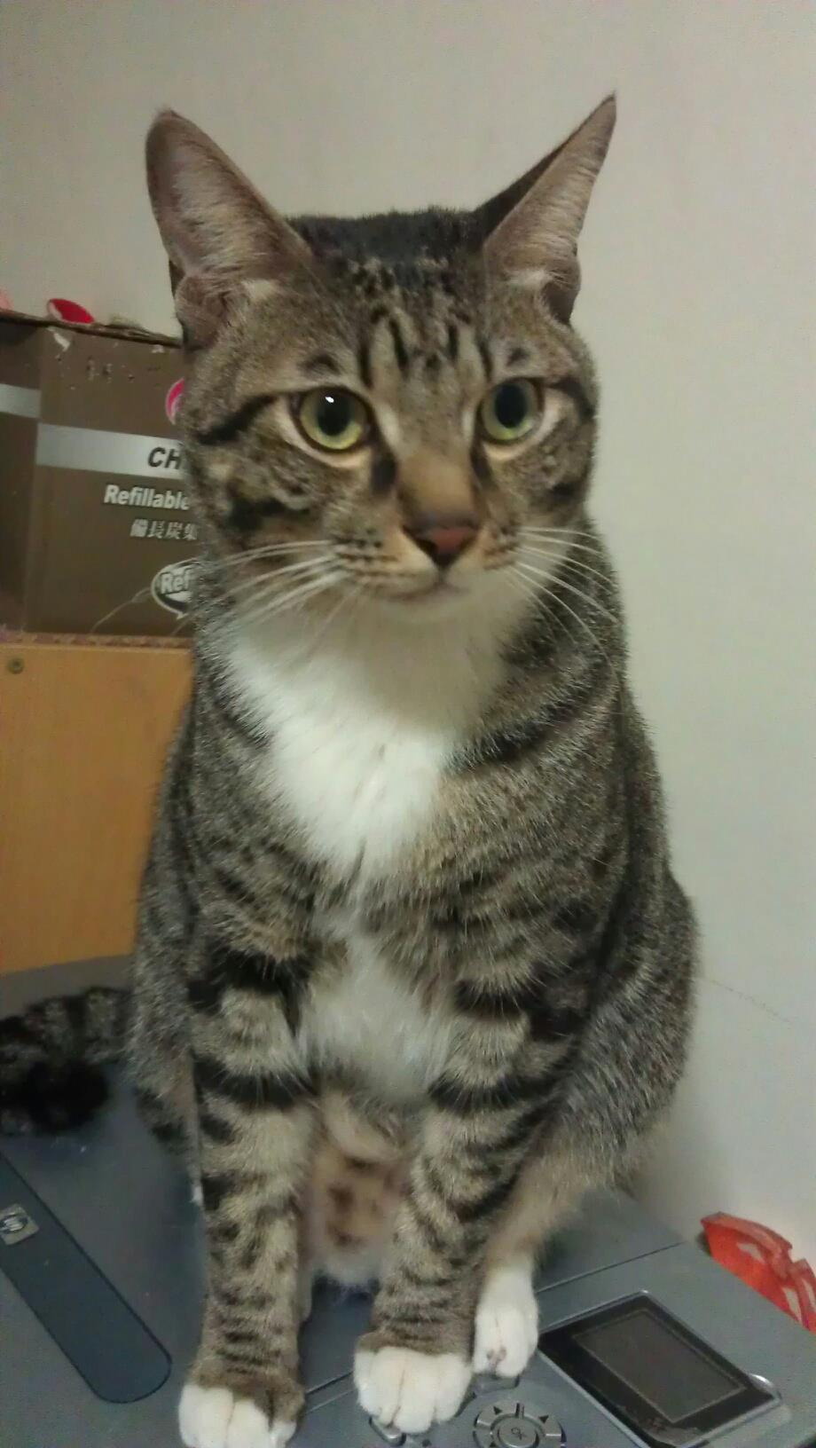 姓名: 兔肥喵 (兔肥) 性別:公公 特徵: 灰色虎斑、胸前有白毛、四支腳都是白色(前腳是手套,後腳是長統襪)、尾巴尾端有小彎曲 (L型) 個性: 不算親人,但可以摸摸 走失地點: 承德路四段3巷附近 走失日期: 2013/3/26 下午 晶片號碼: 900128000680510 若有發現請連絡 0937-025916 林小姐 / 0980-911219 林先生