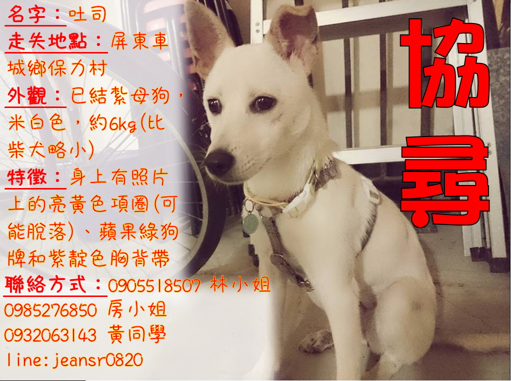我們的送養狗吐司不見了,請大家幫忙注意!